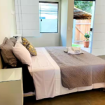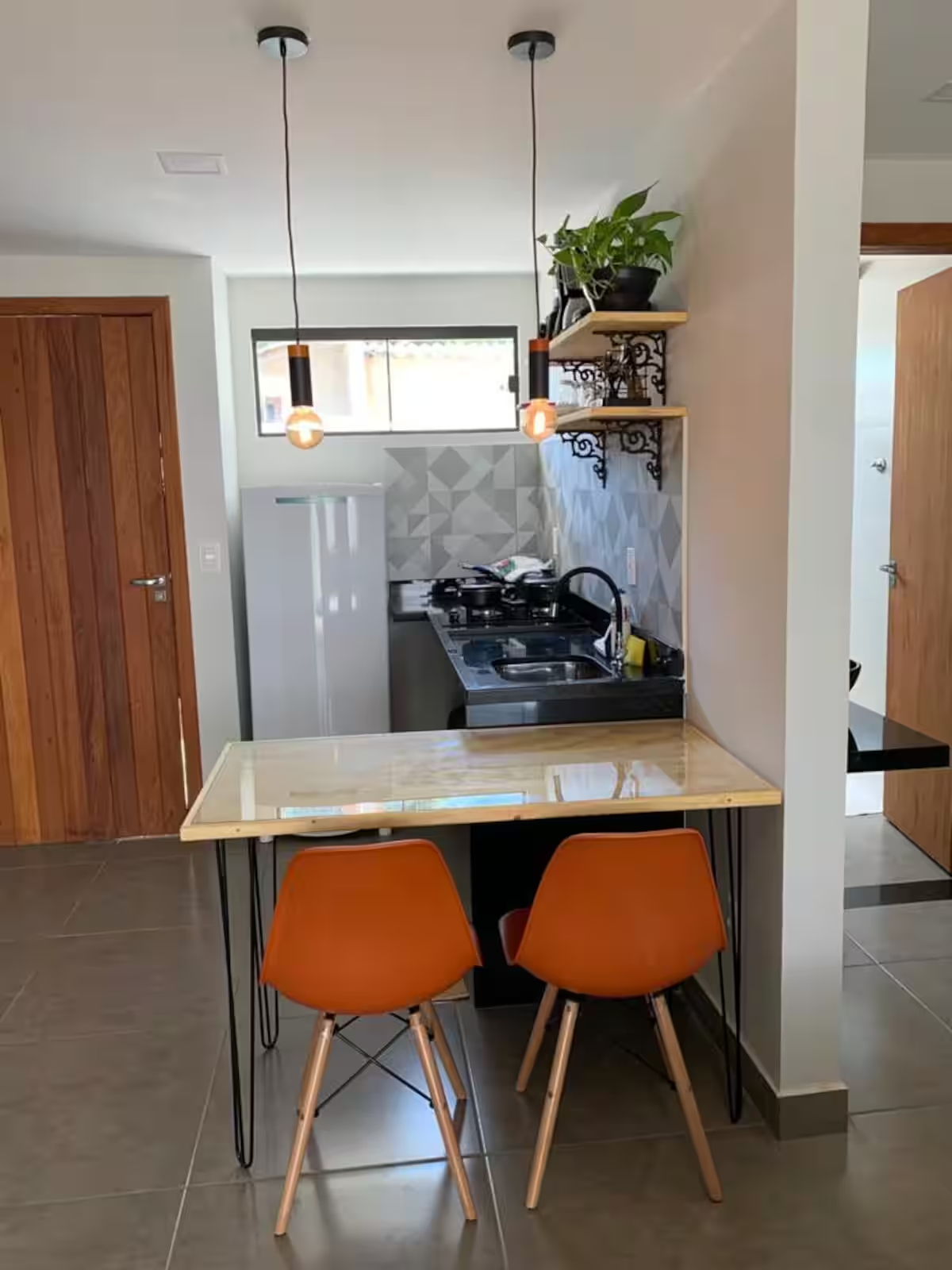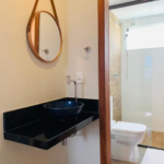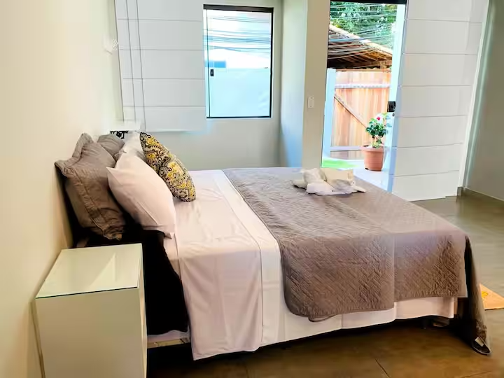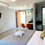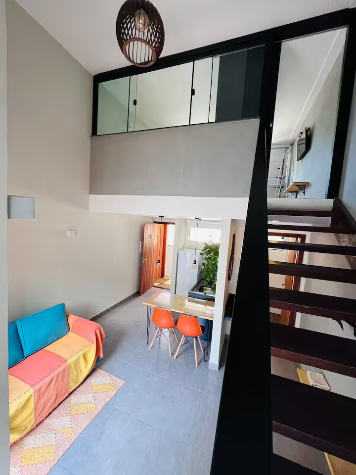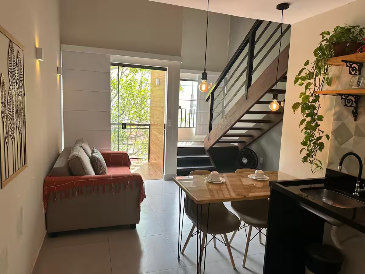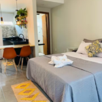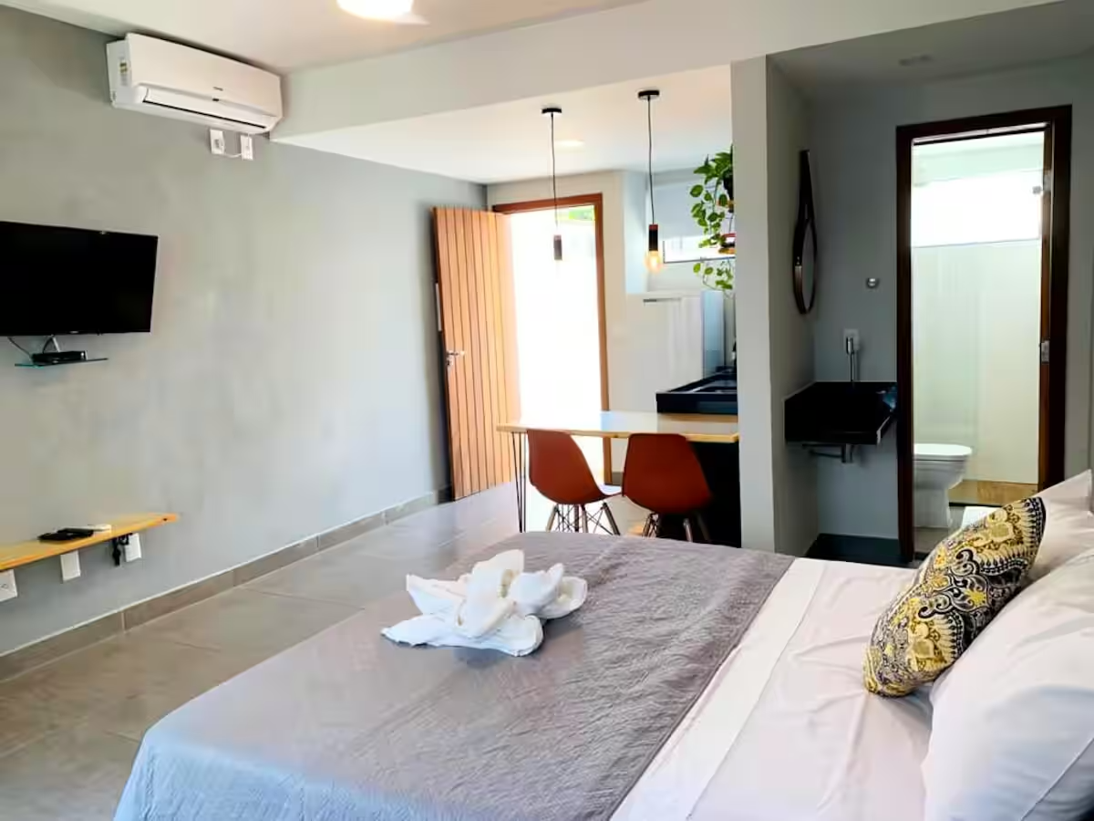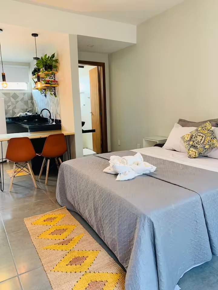 6 lindos flats com cozinha completa, TV, Wi-Fi, ar condicionado, alguns deles possuindo área de trabalho exclusiva, outros varandas privativas, acomodando até 3 pessoas em alguns flats, contendo banheiro privativo em cada um.