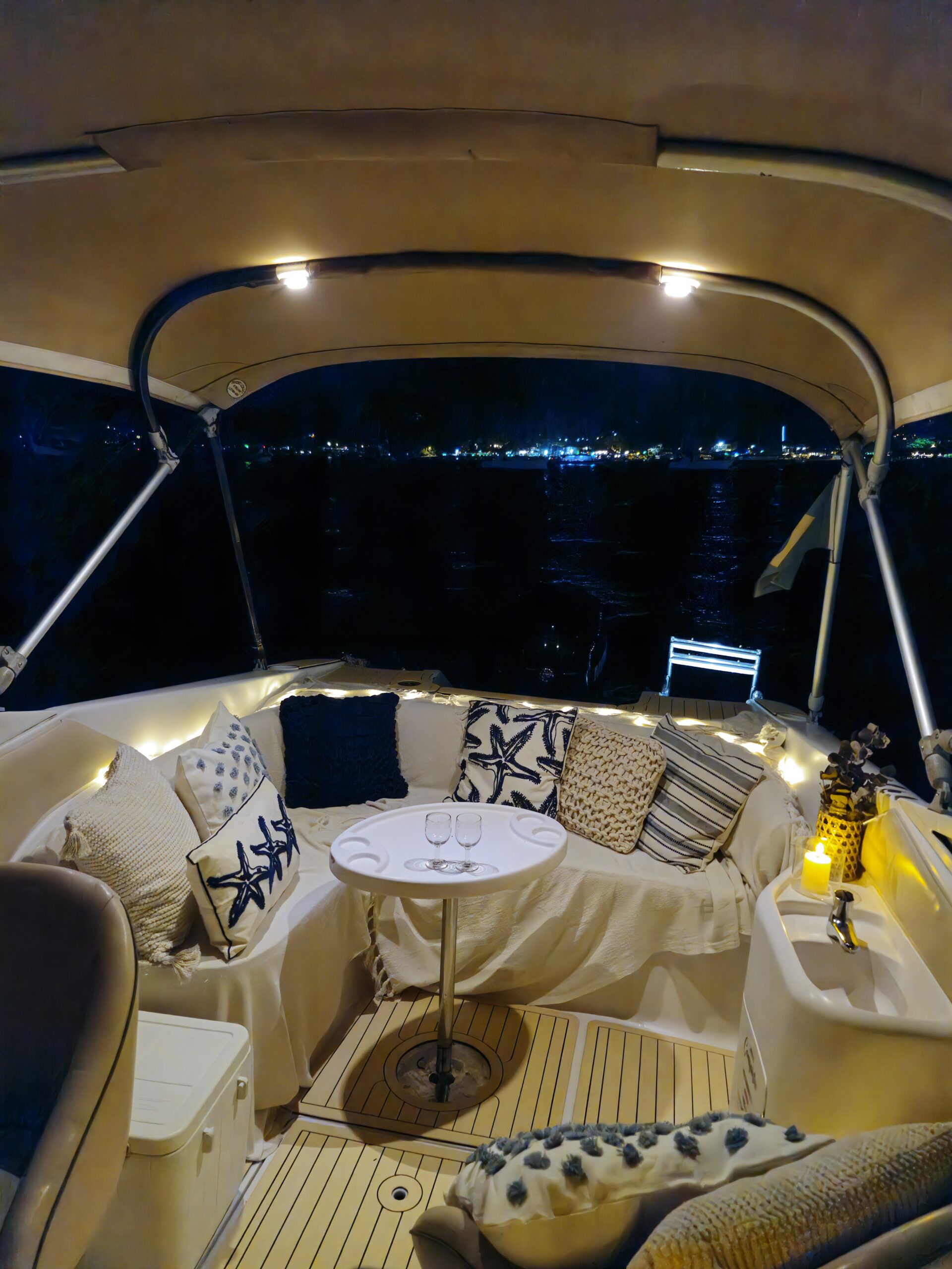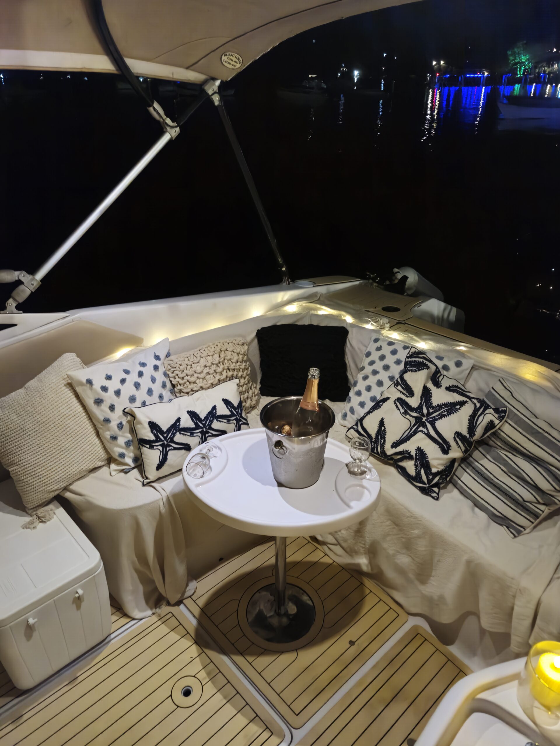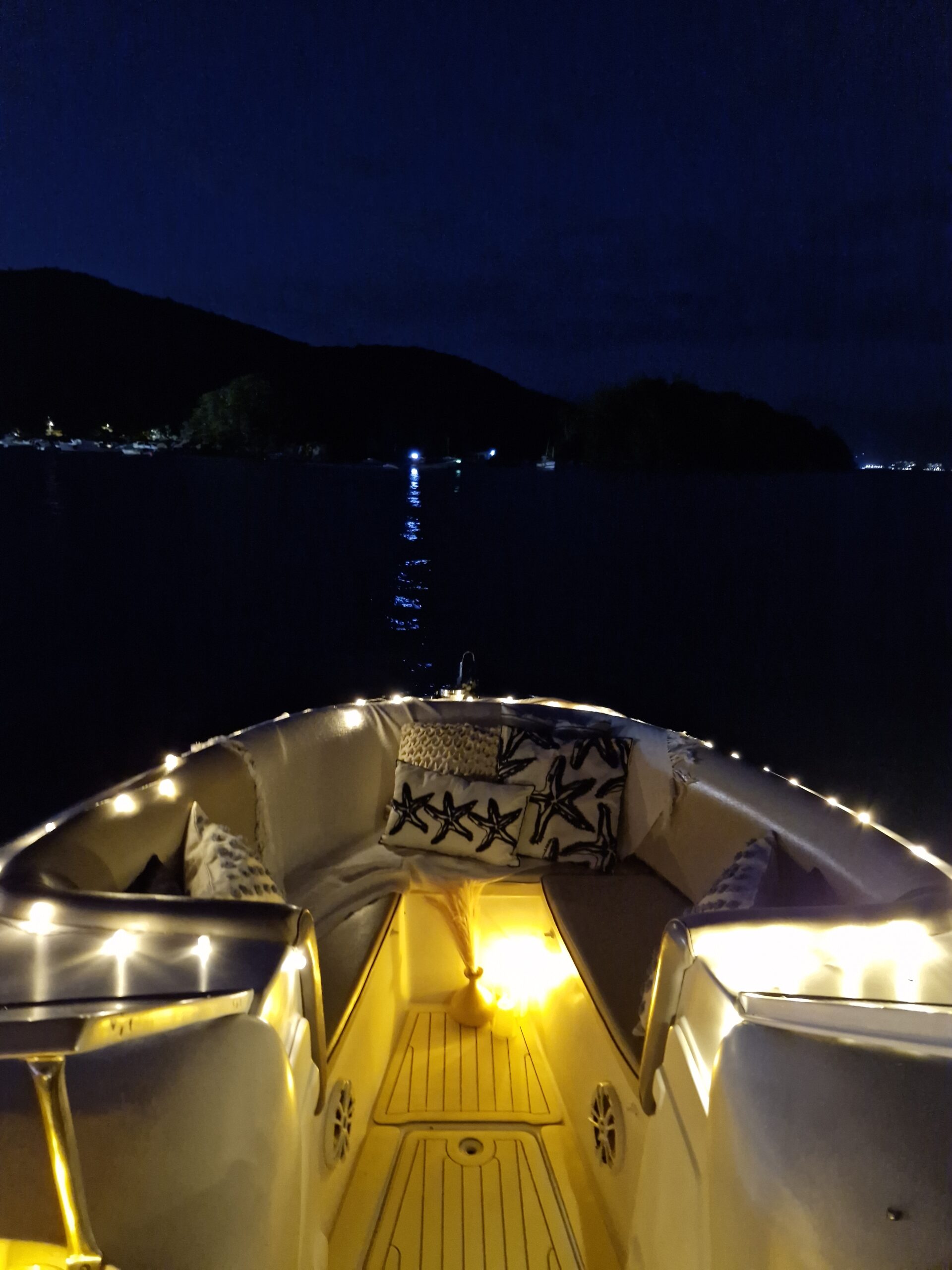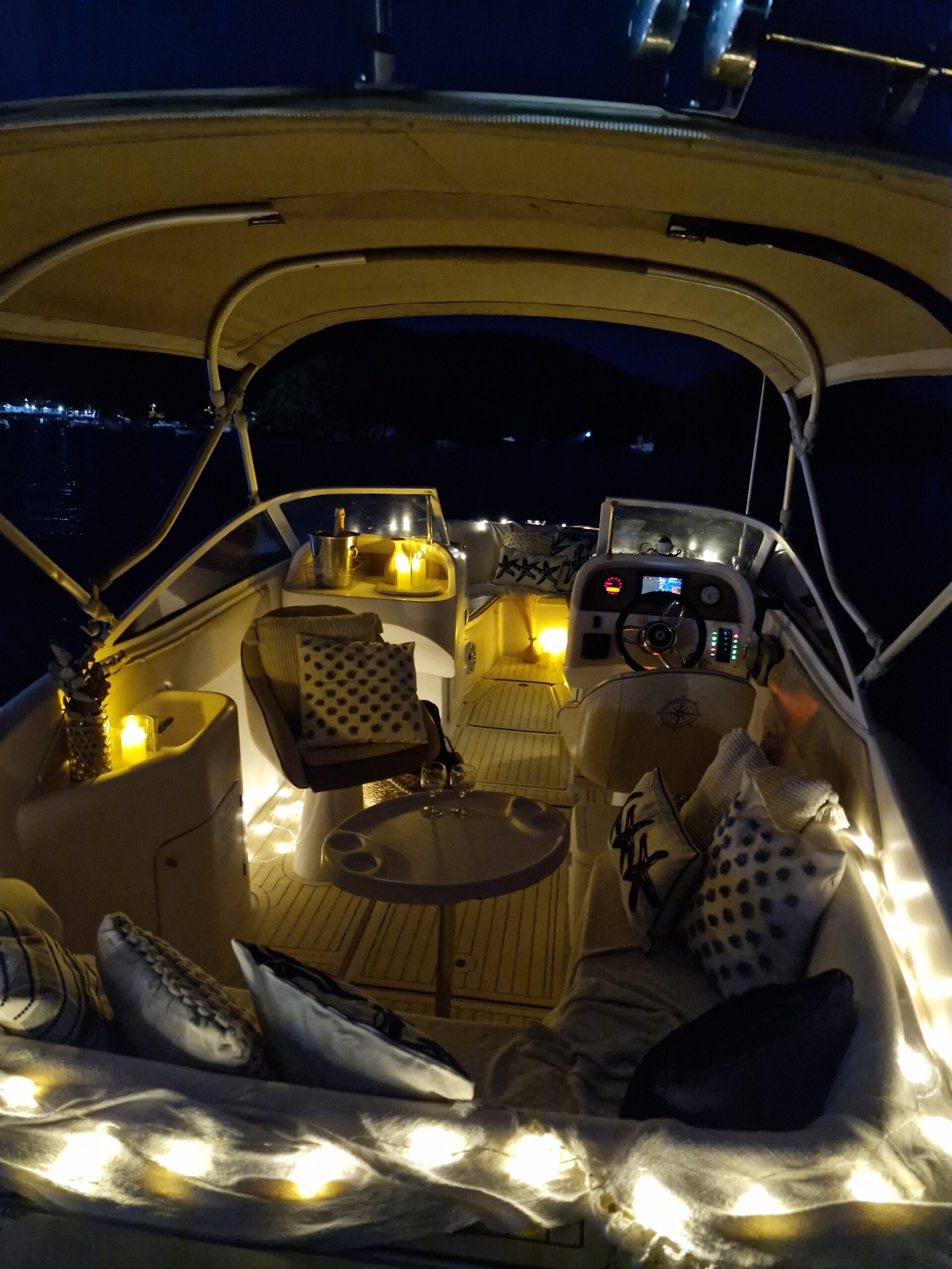 Em um cais privativo, embarcamos o casal na lancha e o marinheiro os deixa a sós curtindo a atmosfera romântica criada pela ambientação Boho Chic, champagne, playlist selecionada e a paz noturna que a enseada das estrelas proporciona.